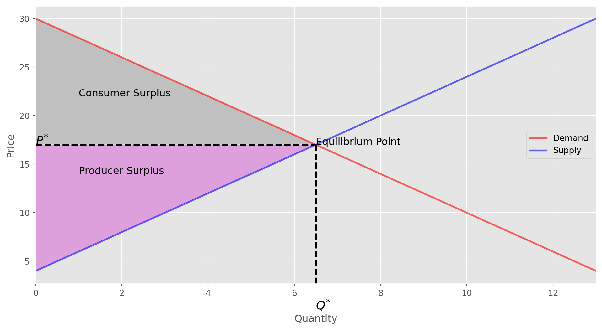 ax.text(1, 14, "Producer Surplus", fontsize=12)