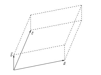 \[ {\rm{Volume}} = \left| {\vec{a} \centerdot \left( {\vec{b} \times \vec{c}} \right)} \right| \]